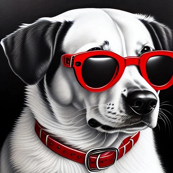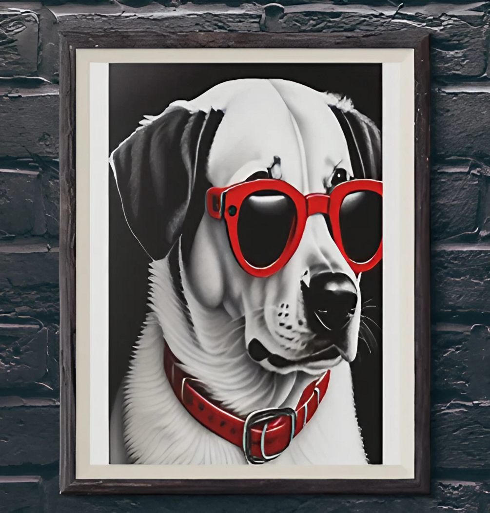 La combinación de la elegancia del blanco y negro con la sofisticación de las gafas rojas crea un contraste que resalta la personalidad del perro en cada trazo. Cada detalle, meticulosamente trabajado, refleja la intensidad de la mirada del can y su curiosidad innata.