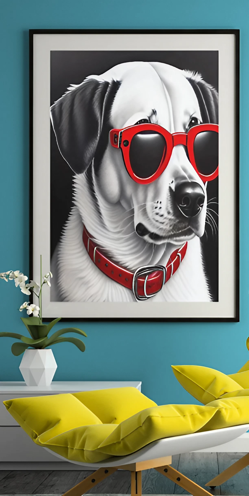 Immerse yourself in the fascinating world of a dog with red glasses, rendered in a stunning black and white painting. This work of art, created with passion and mastery, transcends the limits of the conventional and transports you to a dimension of artistic expression without equal.
